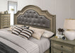Relax like a royal in this gorgeous bedroom piece. The bed features an expansive headboard with beautiful trim molding, which borders a padded leatherette centerpiece with diamond tufting. Each drawer of the matching case goods also feature this molding, surrounding antique-looking knobs and drop pulls. Edges are tapered in a stylistic way reminiscent of classical columns and perfectly match the curved bracket feet. All of these are finished in an antique gray that's warm and welcoming.