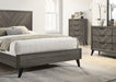 Something about this bed's cool gray finish and chevron grain pattern gives it a stylish vibe. The diagonal replicated grain meet at the center line, forming a V-shaped pattern found on the headboard and front panels. Contemporary elements continue throughout this ensemble, with the black angled legs and sleek finger pulls found on the matching case goods. Coordinating pieces like this set offer a stress-free experience in updating your bedroom decor.